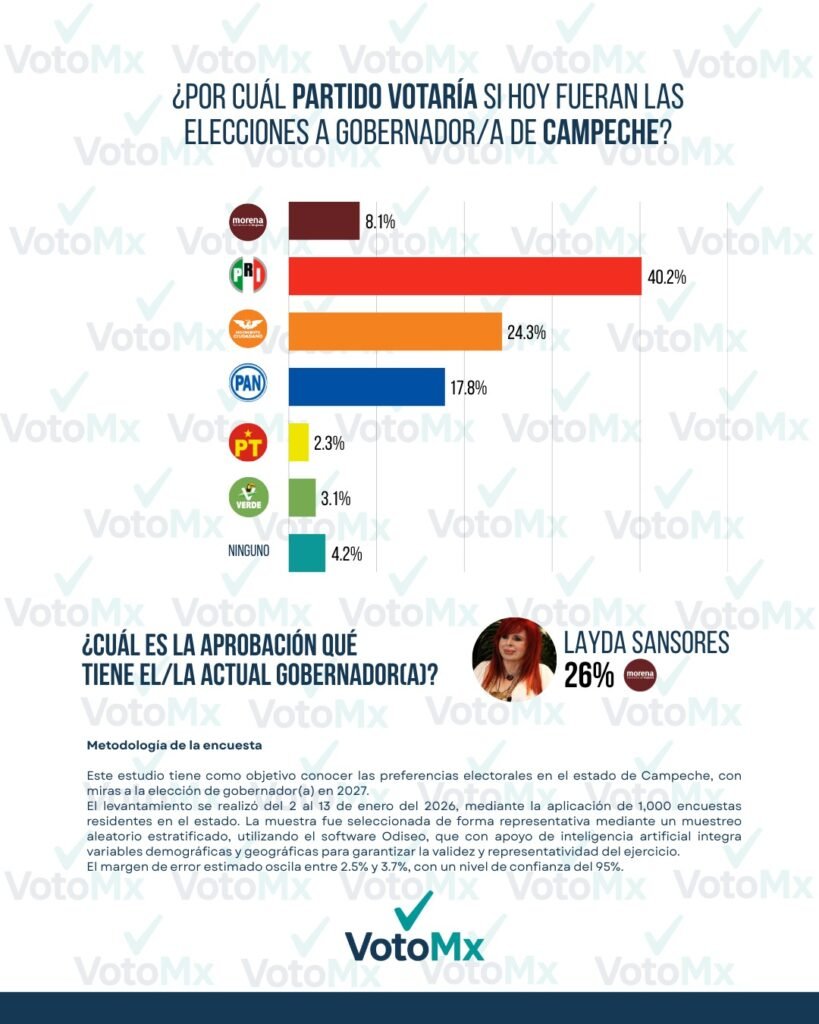 El más reciente estudio de opinión pública realizado por VotoMx revela un panorama político de alta volatilidad en el estado de Campeche. Los datos obtenidos entre el 2 y el 13 de enero de 2026 confirman un profundo desgaste en la imagen de la actual administración estatal, lo que ha provocado un vuelco significativo en las preferencias partidistas de la ciudadanía.