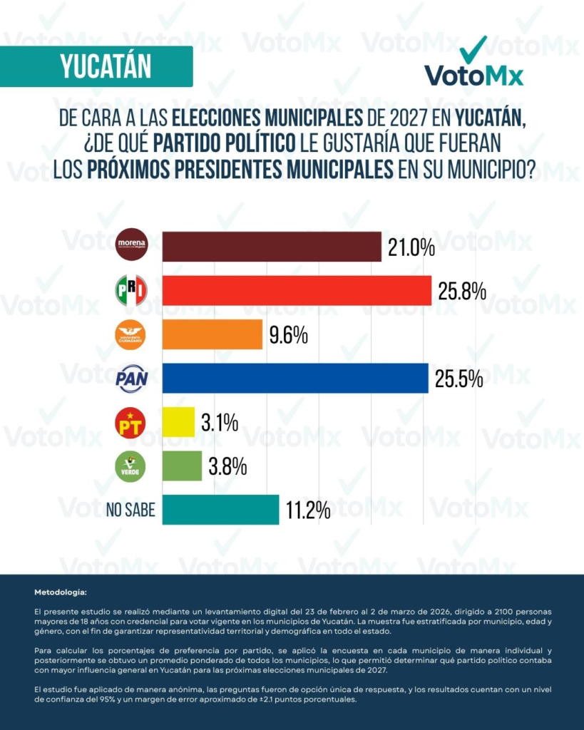 El levantamiento de datos se llevó a cabo del 23 de febrero al 2 de marzo de 2026, mediante una metodología digital dirigida a 2,100 ciudadanos mayores de edad en los diversos municipios de Yucatán. El estudio presenta un nivel de confianza del 95% y un margen de error de ±2.1%, lo que otorga una alta fiabilidad a la estrecha diferencia observada entre los punteros.
