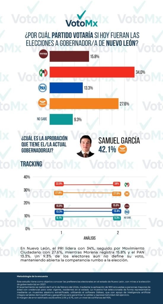 Si las elecciones para Gobernador/a de Nuevo León fueran hoy, el Partido Revolucionario Institucional (PRI) se posicionaría como el líder de la contienda con un 34.0% de la intención de voto.